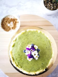 Ha kihűlt a torta, vízgőz felett olvaszd össze a fehércsokit, és a tejszínt. Majd levéve a gőzről, szitáld bele a matcha tea port, és így is keverd fényesre. Kend meg a krémmel a tortád, és díszítsd élő virággal, és friss gyümölcsökkel.