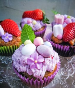 Ha mindened kihűlt és megdermedt, habzsák segítségével csiga alakban díszítsd az áfonyakrémmel a muffint. Dekoráld friss gyümölcsökkel.