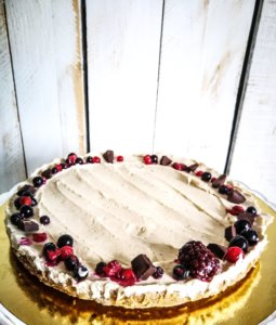 Késes darálóban aprítsd finomra a zabkekszet, majd keverd össze az olvasztott vajjal. Bélelj ki sütőpapírral egy torta formát, és nyomkodd az aljára a keksz alapot, ezután tedd a mélyhűtőbe pihenni.